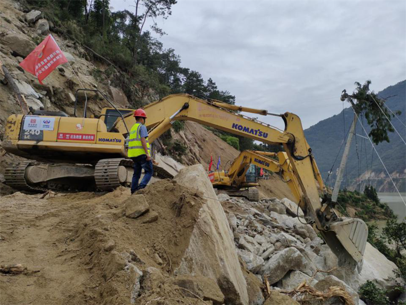 搶險隊伍,馬上出發(fā)!集團領(lǐng)導班子立即召開碰頭會,分析研判形勢,安排部署工作,密切關(guān)注震區(qū)態(tài)勢,成立抗震救災領(lǐng)導小組,副總經(jīng)理鐘焱宇率現(xiàn)場指揮組趕赴石棉靠前指揮搶險救災。正在石棉G108線施工的康藏路橋公司項目部組成10人搶險救援小分隊,攜帶挖掘機4臺、拖車4臺、裝載機3臺、交通運輸車2輛、無人機1臺,第一時間到就地搶險工作,震后7小時,完成國道G108線馬富至菩薩崗約40公里路段、6處塌方點1600余方土石方清理,爾后轉(zhuǎn)戰(zhàn)石棉縣新民鄉(xiāng)進行通鄉(xiāng)道路搶通作業(yè)。