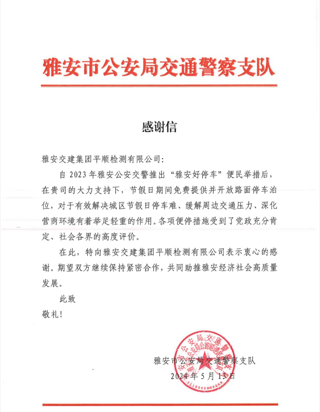 近日,雅安交建集團(tuán)平順公司收到一封來(lái)自雅安市公安局交通警察支隊(duì)的感謝信,對(duì)平順公司積極響應(yīng)雅安公安交警“雅安好停車”便民措施,在節(jié)假日期間免費(fèi)提供并開放路面停車泊位表示感謝。