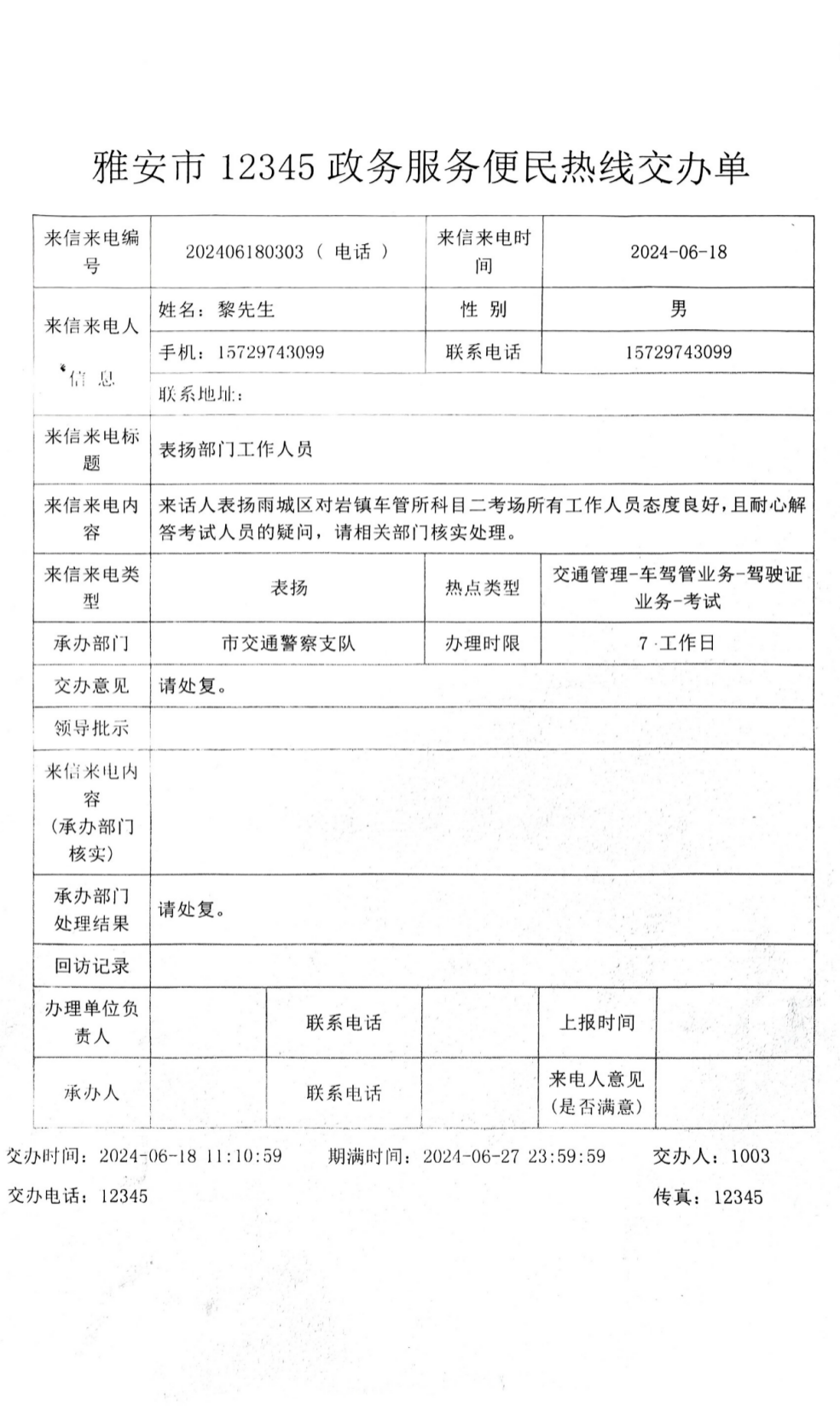 2024年6月18日,平順公司收到一封特殊的來信,市民黎先生通過“12345”政務(wù)服務(wù)便民熱線“...表揚(yáng)科目二考場(chǎng)所有工作人員態(tài)度良好,且耐心解答考試人員的疑問...”。字里行間表達(dá)了對(duì)我公司科目二所有工作人員工作的滿意和認(rèn)可。