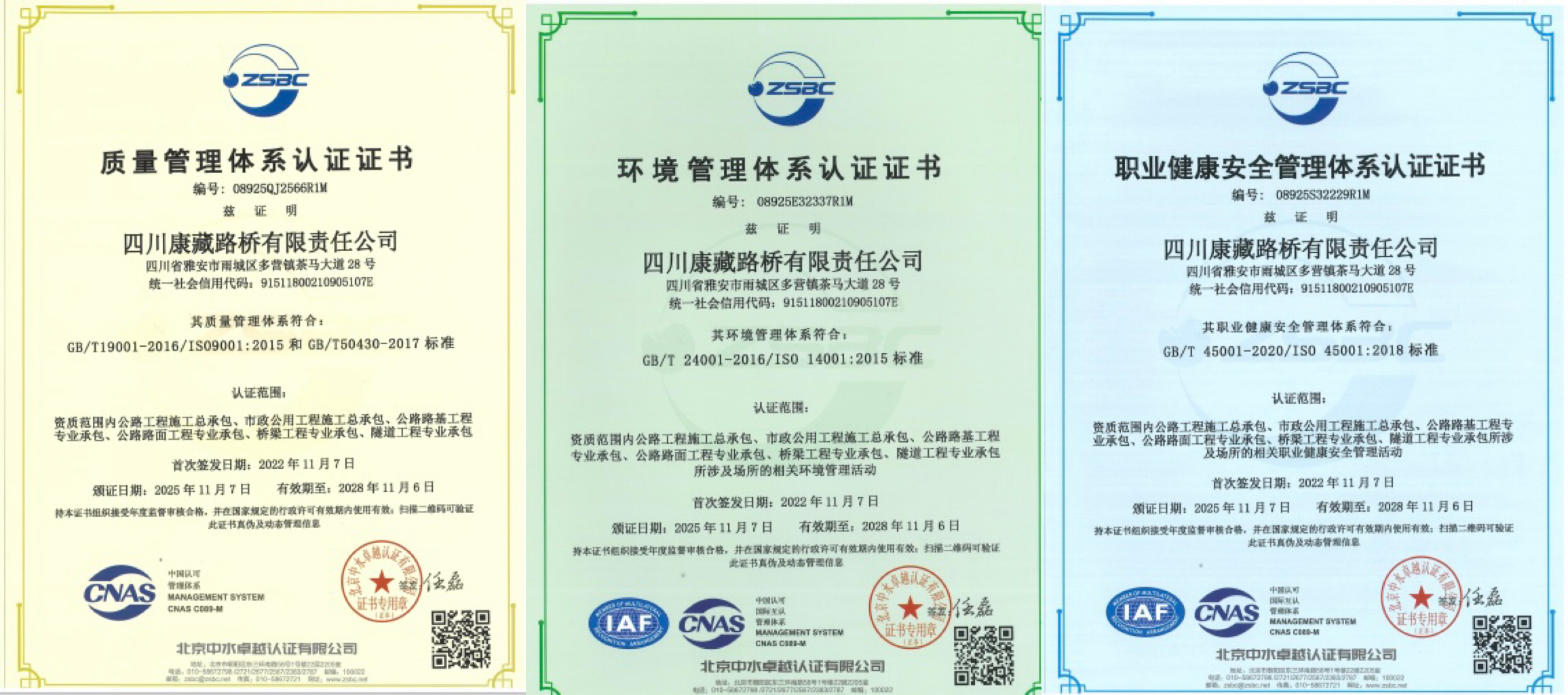 本次認證范圍全面覆蓋公司資質(zhì)范圍內(nèi)的公路工程施工總承包、市政公用工程施工總承包,以及公路路基、路面、橋梁、隧道工程專業(yè)承包等相關(guān)業(yè)務領(lǐng)域的質(zhì)量管理活動,同時包含所涉場所的環(huán)境管理與職業(yè)健康安全管理。通過“三體系”認證,標志著康藏路橋公司在規(guī)范化、標準化與精細化管理方面邁出重要一步,為企業(yè)進一步拓展市場、實現(xiàn)可持續(xù)發(fā)展奠定了更加堅實的基礎。