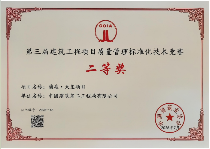 近日,交建開(kāi)發(fā)公司旗下“蘭庭・天璽”項(xiàng)目在中國(guó)建筑業(yè)協(xié)會(huì)組織的“第三屆建筑工程項(xiàng)目質(zhì)量管理標(biāo)準(zhǔn)化技術(shù)競(jìng)賽”中榮獲二等獎(jiǎng)。此次獲獎(jiǎng),標(biāo)志著“蘭庭・天璽”項(xiàng)目的質(zhì)量管理體系與工程實(shí)體質(zhì)量獲得了行業(yè)權(quán)威認(rèn)可,為項(xiàng)目后續(xù)創(chuàng)建更高層次的品質(zhì)獎(jiǎng)項(xiàng)積累了寶貴經(jīng)驗(yàn)。