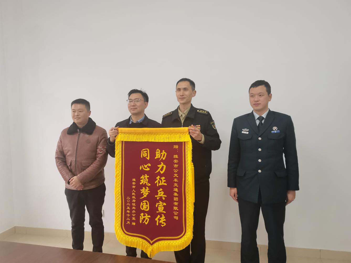 近日,雅安市人民政府征兵辦公室副主任、雅安軍分區(qū)動(dòng)員處上校處長(zhǎng)賈子龍一行專程赴公交集團(tuán)贈(zèng)送錦旗,感謝公交集團(tuán)在2025年度征兵公益宣傳工作中作出的貢獻(xiàn),公司董事長(zhǎng)李強(qiáng)軍接待并開展座談。