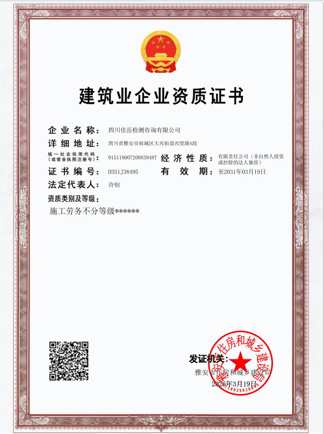 面對建筑檢測服務市場日趨激烈的競爭態(tài)勢和業(yè)務結構單一的瓶頸,佳岳公司堅持以提質升級為核心,主動破局、向內挖潛,將資質提升作為增強核心競爭力的關鍵突破口。3月19日,公司成功取得建筑業(yè)企業(yè)施工勞務資質證書,標志著公司具備承接各類施工勞務作業(yè)的法定資格,為拓展經營領域、完善業(yè)務鏈條注入新動能。