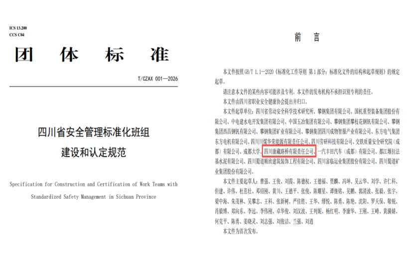 近日,由四川省職業(yè)安全健康協(xié)會牽頭編制的《四川省安全管理標(biāo)準(zhǔn)化班組建設(shè)和認(rèn)定規(guī)范》(T/CZAX001—2026)正式發(fā)布,康藏路橋公司作為四川省建筑施工領(lǐng)域的代表企業(yè),全程深度參與該標(biāo)準(zhǔn)的編寫工作。