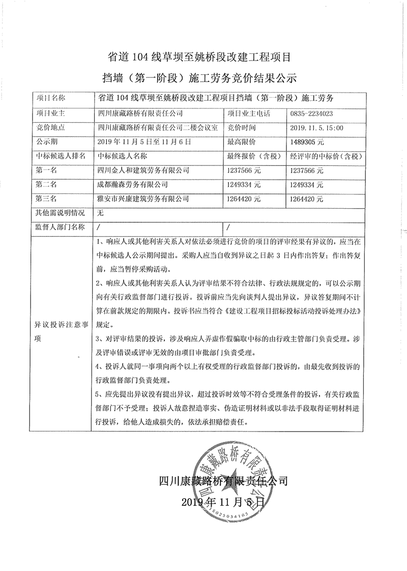 四川康藏路橋有限責(zé)任公司省道104線(xiàn)草壩至姚橋段改建工程項(xiàng)目擋墻(第一階段)施工勞務(wù)競(jìng)價(jià)結(jié)果公示