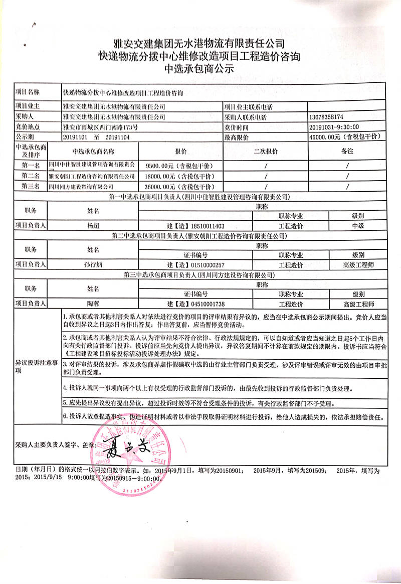 雅安交建集團(tuán)無(wú)水港物流有限責(zé)任公司快遞物流分撥中心維修改造項(xiàng)目工程造價(jià)咨詢中選承包商公示