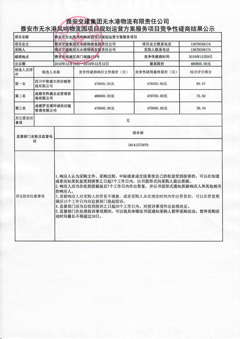 雅安交建集團(tuán)無水港物流有限責(zé)任公司雅安市無水港鳳鳴物流園項(xiàng)目規(guī)劃運(yùn)營(yíng)方案服務(wù)項(xiàng)目競(jìng)爭(zhēng)性磋商結(jié)果公示