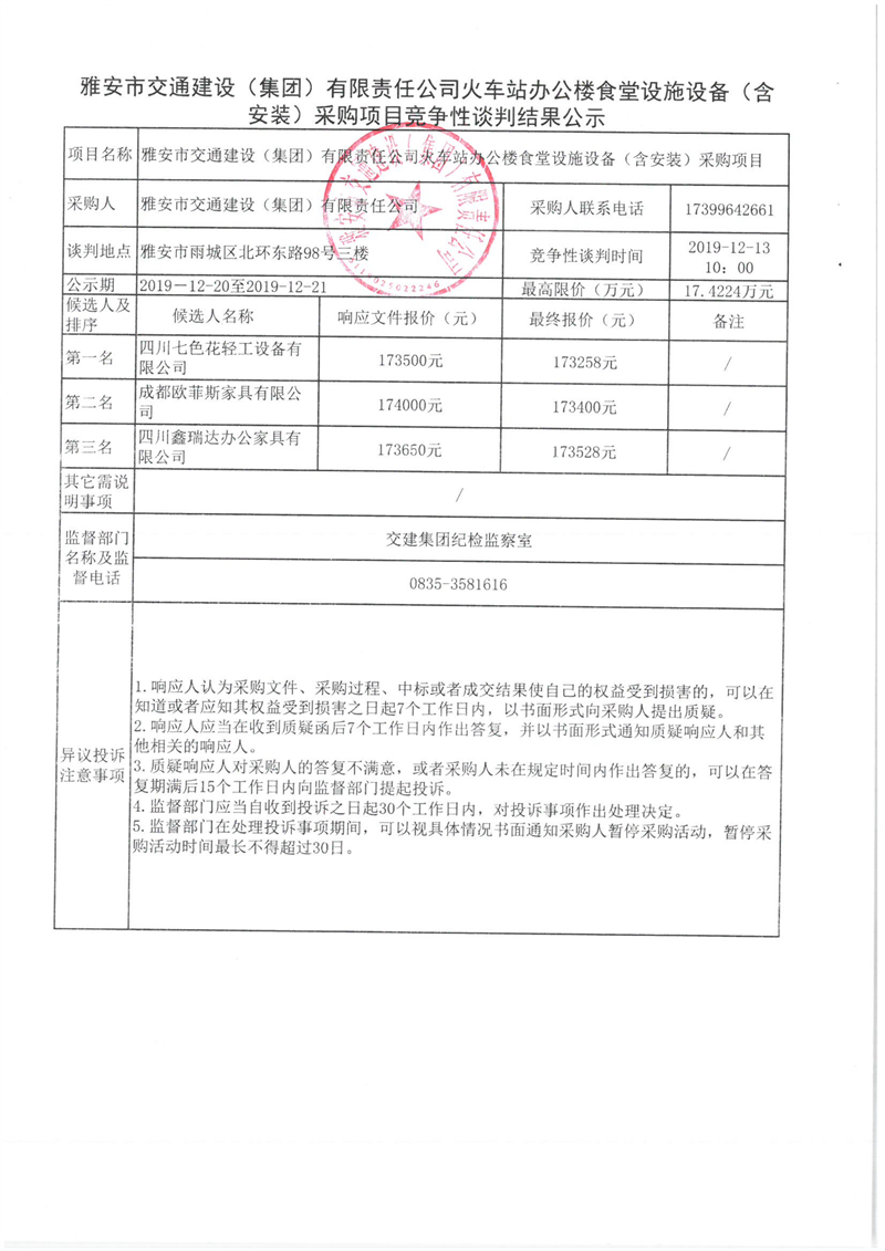 雅安市交通建設(shè)(集團)有限責任公司火車站辦公樓食堂設(shè)施設(shè)備(含安裝)采購項目競爭性談判結(jié)果公示