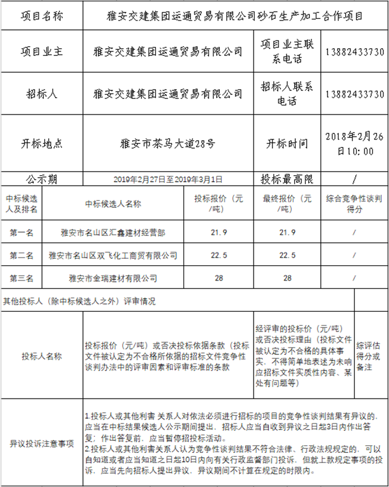 雅安交建集團(tuán)運通貿(mào)易有限公司砂石生產(chǎn)加工合作項目競爭性談判結(jié)果公示