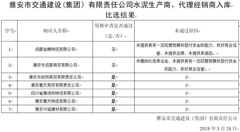 雅安市交通建設(集團)有限責任公司水泥生產(chǎn)商、代理經(jīng)銷商入庫比選結(jié)果公示