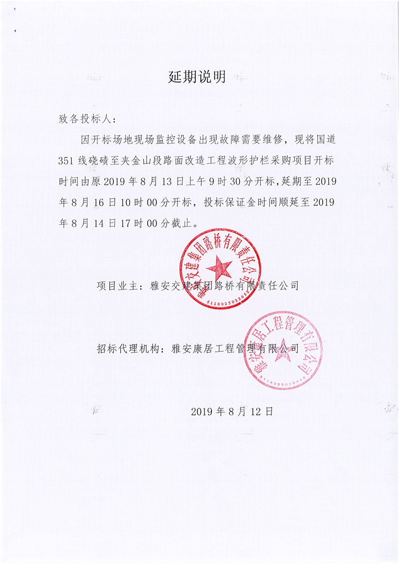 雅安交建集團(tuán)路橋有限責(zé)任公司國(guó)道351線磽磧至夾金山段路面改造工程波形護(hù)欄采購(gòu)延期說(shuō)明