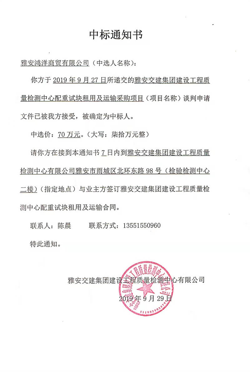 雅安交建集團建設(shè)工程質(zhì)量檢測中心配重試塊租用及運輸采購項目中標公示