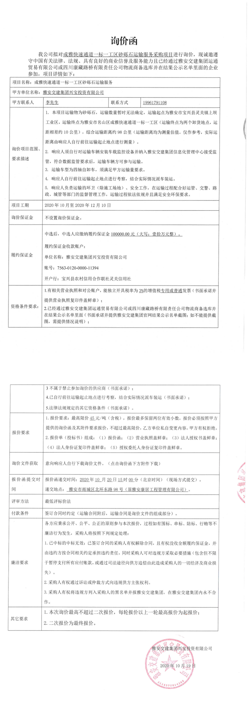 雅安交建集團(tuán)興寶投資有限公司成雅快速通道一標(biāo)一工區(qū)砂礫石運輸服務(wù)采購項目詢價函