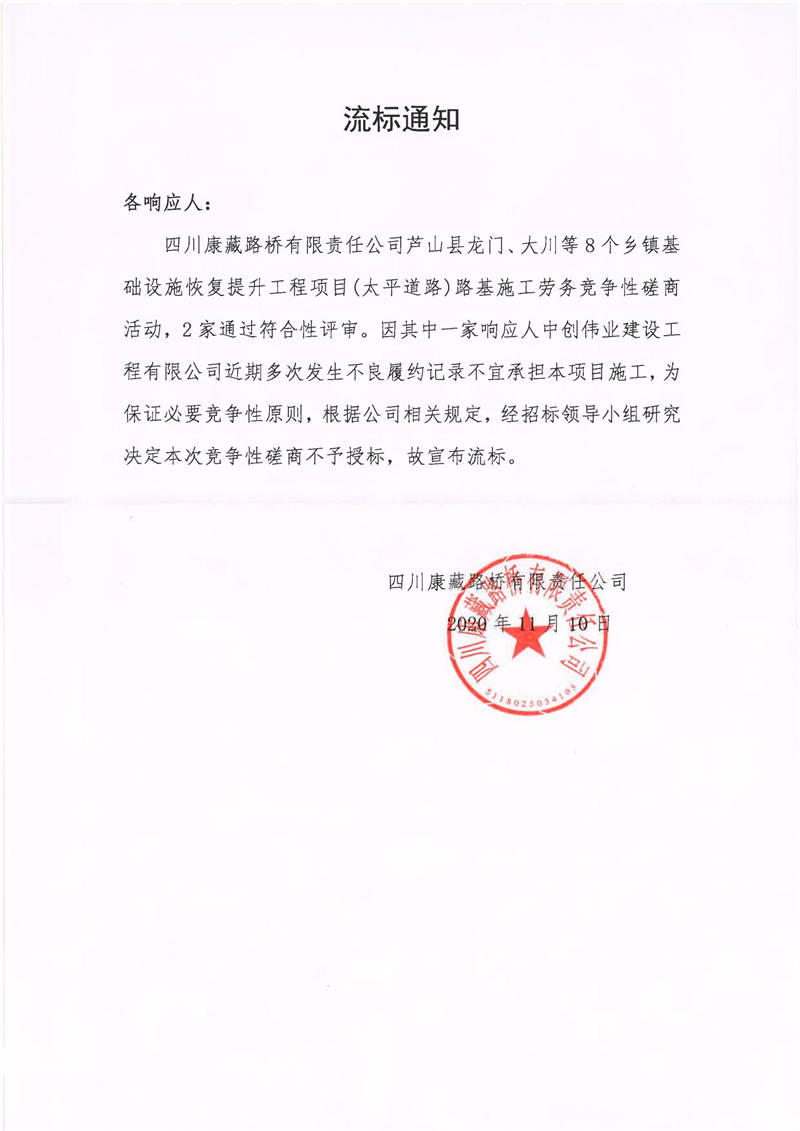 四川康藏路橋有限責(zé)任公司蘆山縣龍門(mén)、大川等8個(gè)鄉(xiāng)鎮(zhèn)基礎(chǔ)設(shè)施恢復(fù)提升工程項(xiàng)目(太平道路)路基施工勞務(wù)流標(biāo)通知