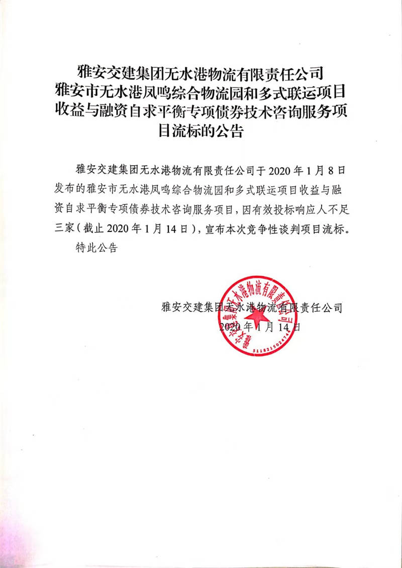 雅安交建集團無水港物流有限責(zé)任公司雅安市無水港鳳鳴綜合物流園和多式聯(lián)運項目收益與融資自求平衡專項債券技術(shù)咨詢服務(wù)項目流標(biāo)的公告