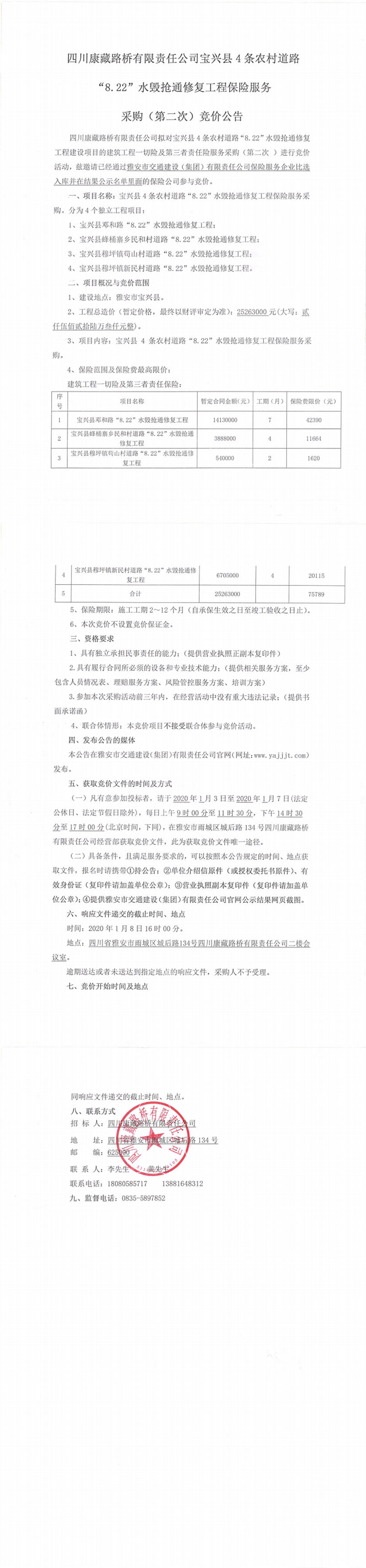 四川康藏路橋有限責(zé)任公司寶興縣4條農(nóng)村道路“8.22”水毀搶通修復(fù)工程保險服務(wù)采購(第二次)競價公告