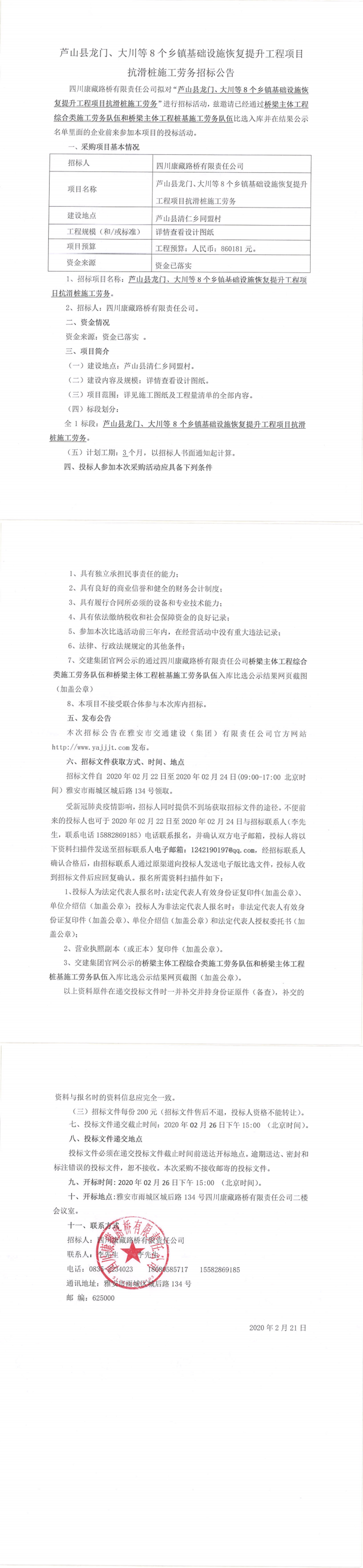 四川康藏路橋有限責(zé)任公司蘆山縣龍門(mén)、大川等8個(gè)鄉(xiāng)鎮(zhèn)基礎(chǔ)設(shè)施恢復(fù)提升工程項(xiàng)目抗滑樁施工勞務(wù)招標(biāo)公告