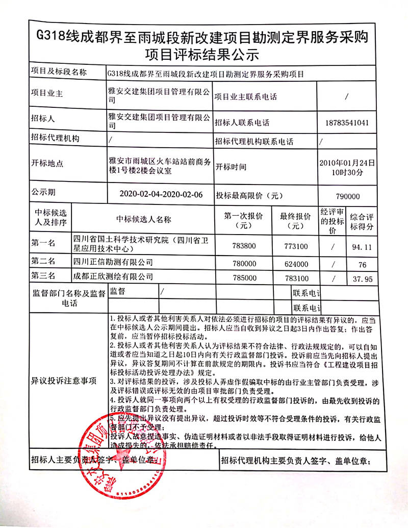 雅安交建集團項目管理有限公司G318線成都界至雨城段新改建項目勘測定界服務(wù)采購項目評標結(jié)果公示