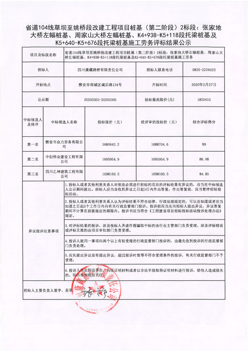 四川康藏路橋有限責任公司省道104線草壩至姚橋段改建工程項目樁基(第二階段)2標段:張家地大橋左幅樁基、周家山大橋左幅樁基、K4+938-K5+118段托梁樁基及K5+640-K5+676段托梁樁基施工勞務評標結果公示