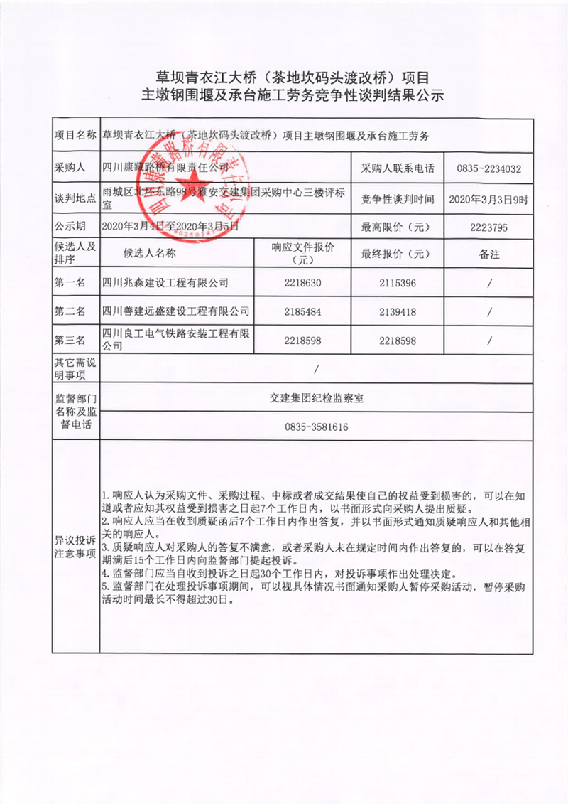 四川康藏路橋有限責(zé)任公司草壩青衣江大橋(茶地坎碼頭渡改橋)項(xiàng)目主墩鋼圍堰及承臺(tái)施工勞務(wù)競爭性談判結(jié)果公示