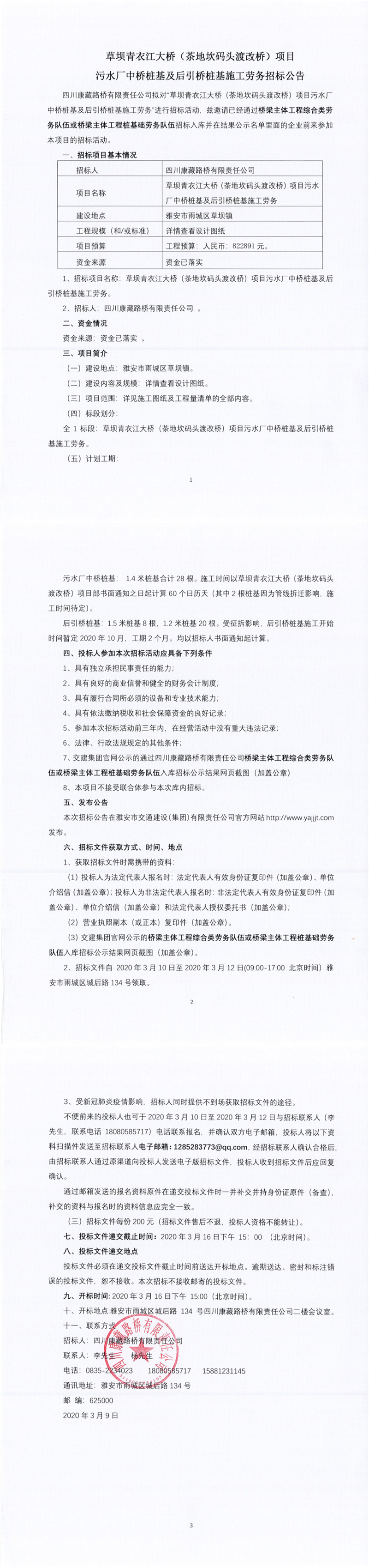 四川康藏路橋有限責(zé)任公司草壩青衣江大橋(茶地坎碼頭渡改橋)項(xiàng)目污水廠(chǎng)中橋樁基及后引橋樁基施工勞務(wù)招標(biāo)公告