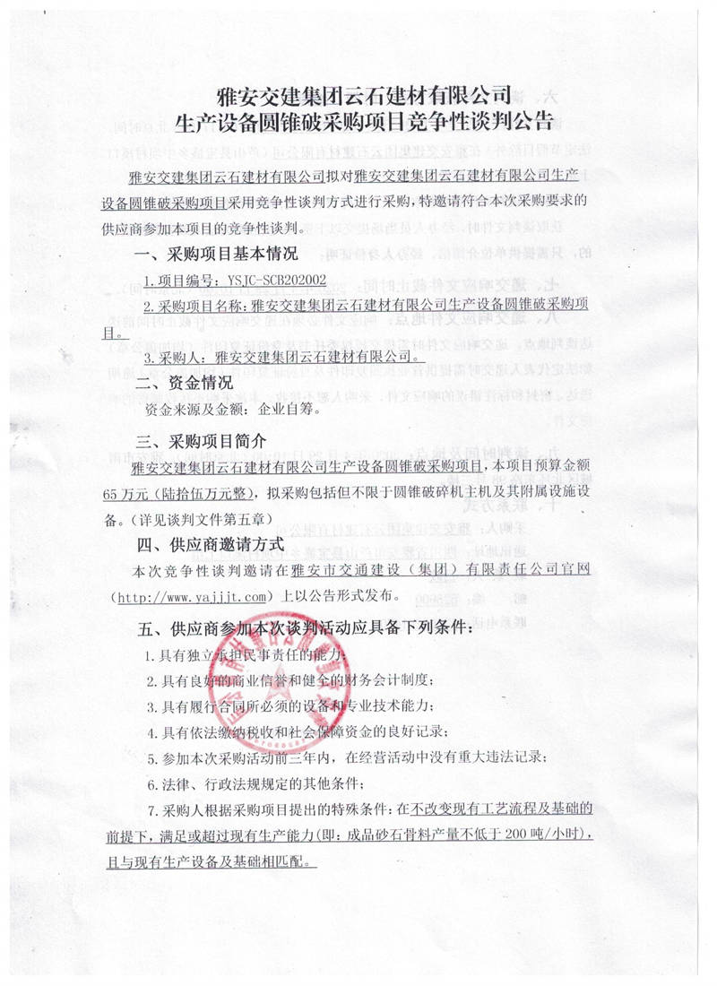 雅安交建集團云石建材有限公司生產(chǎn)設(shè)備圓錐破采購項目競爭性談判公告