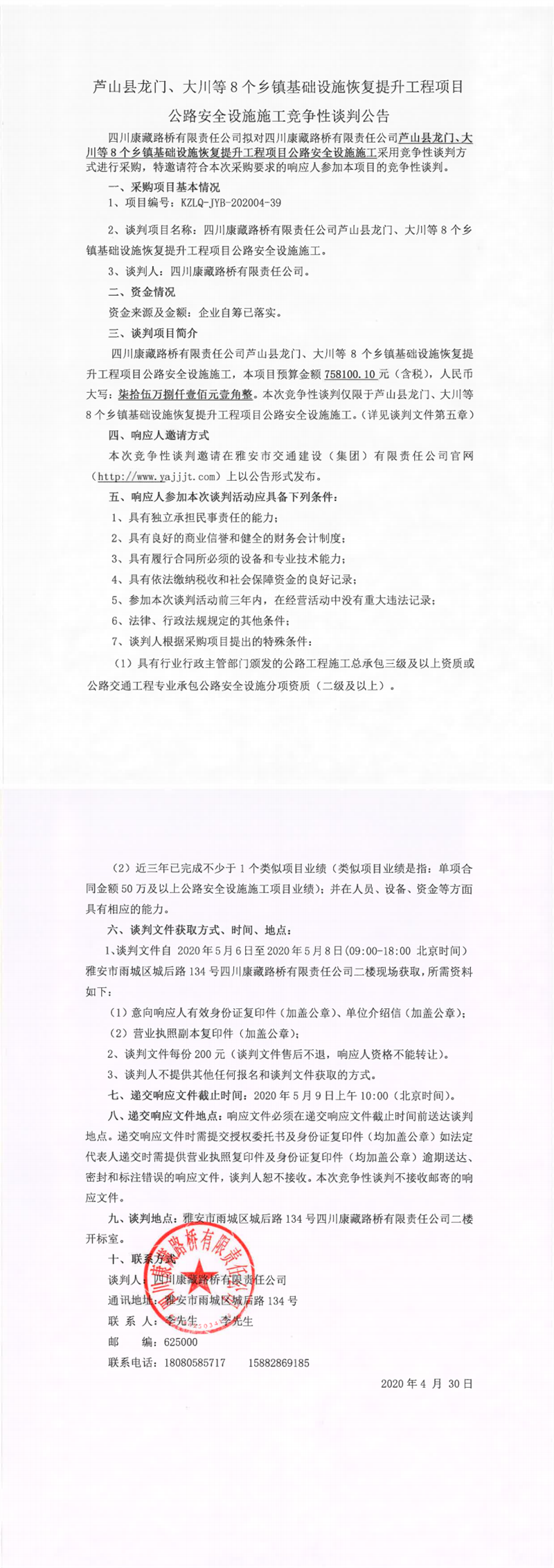 四川康藏路橋有限責任公司蘆山縣龍門、大川等8個鄉(xiāng)鎮(zhèn)基礎(chǔ)設(shè)施恢復提升工程項目公路安全設(shè)施施工競爭性談判公告