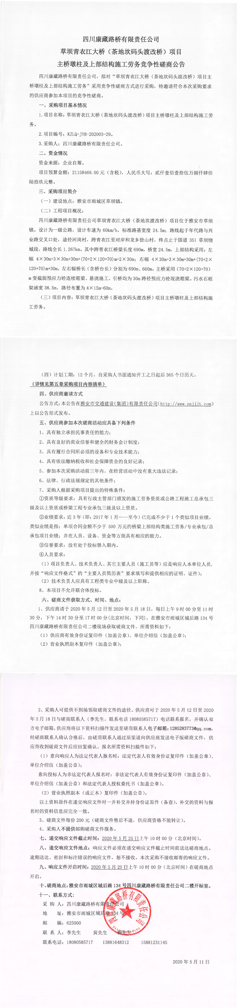四川康藏路橋有限責(zé)任公司草壩青衣江大橋(茶地坎碼頭渡改橋)項(xiàng)目主橋墩柱及上部結(jié)構(gòu)施工勞務(wù)競(jìng)爭(zhēng)性磋商公告