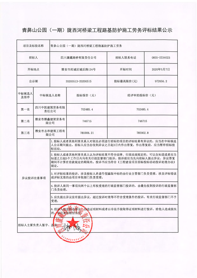 四川康藏路橋有限責任公司青鼻山公園(一期)隴西河橋梁工程路基防護施工勞務評標結果公示