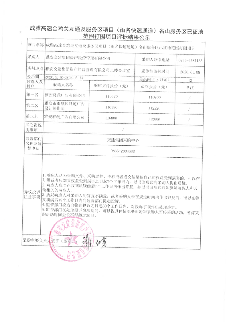 雅安交建集團資產(chǎn)經(jīng)營管理有限公司成雅高速金雞關(guān)互通及服務(wù)區(qū)項目(雨名快速通道)名山服務(wù)區(qū)已征地范圍打圍項目評標結(jié)果公示