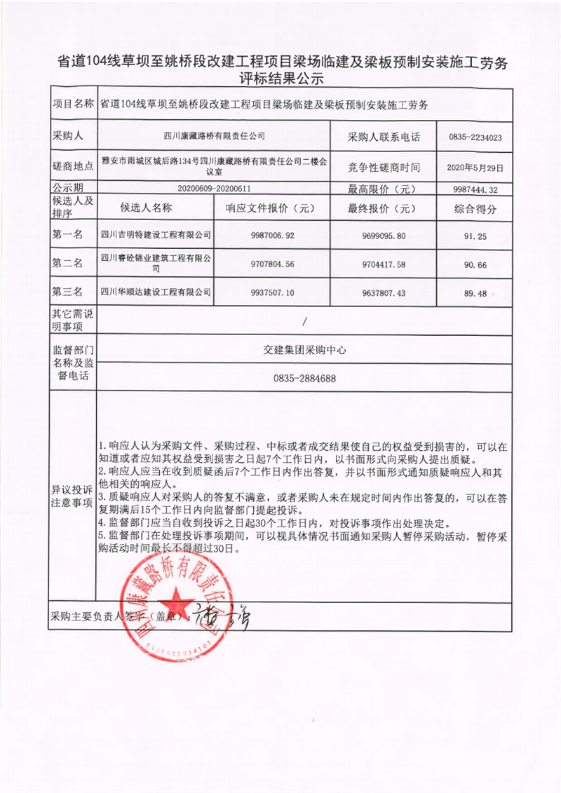 四川康藏路橋有限責任公司省道104線草壩至姚橋段改建工程項目梁場臨建及梁板預制安裝施工勞務評標結(jié)果公示