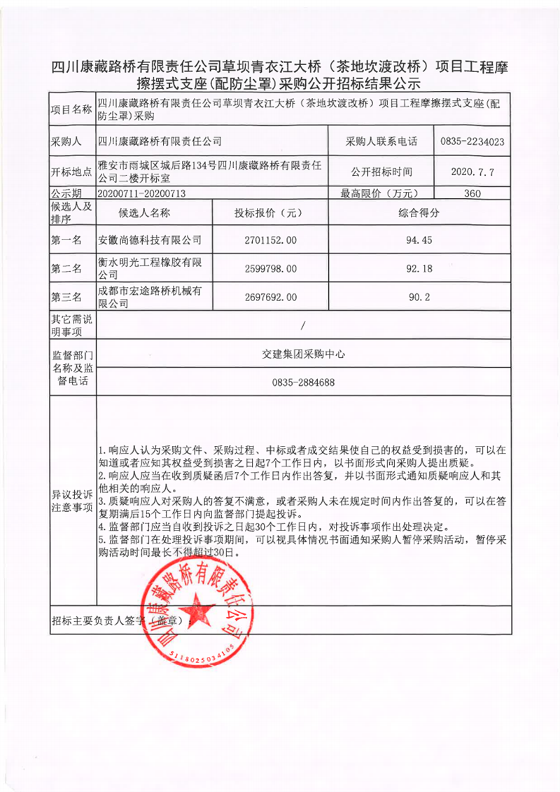 四川康藏路橋有限責(zé)任公司草壩青衣江大橋(茶地坎渡改橋)項目工程摩擦擺式支座(配防塵罩)采購公開招標(biāo)結(jié)果公示