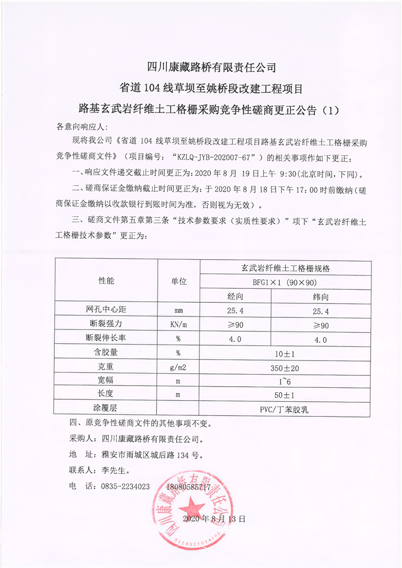 四川康藏路橋有限責任公司省道104線草壩至姚橋段改建工程項目路基玄武巖纖維土工格柵采購競爭性磋商更正公告(1)