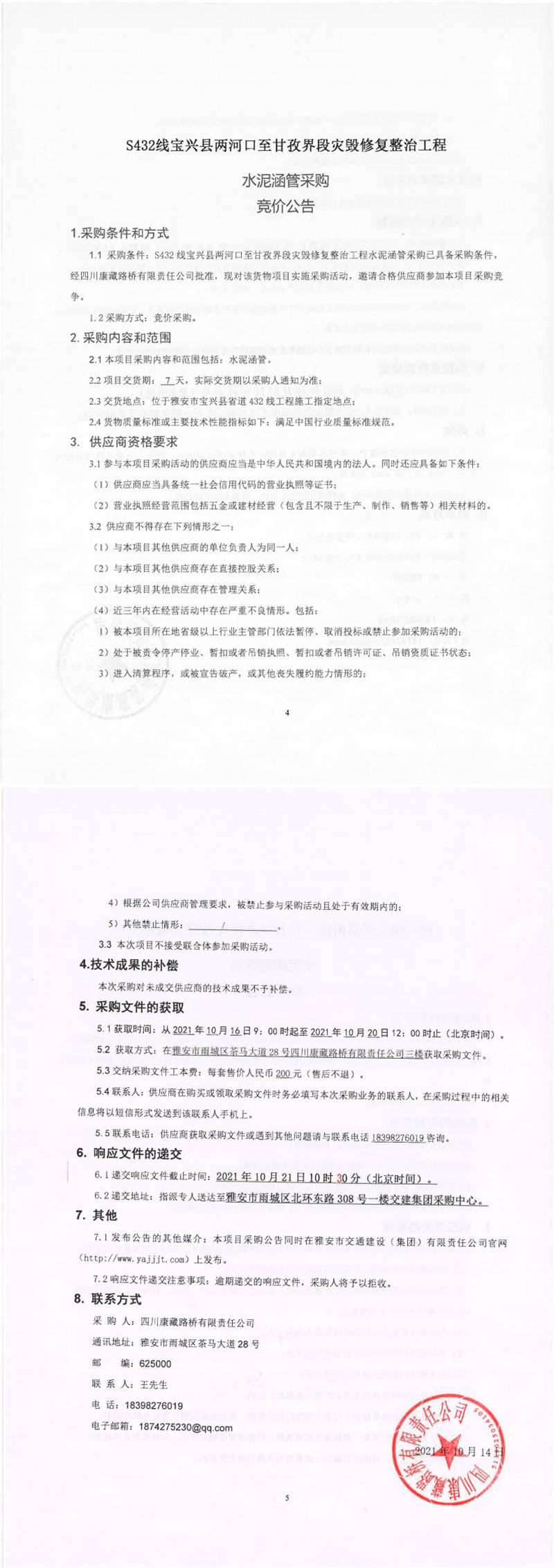四川康藏路橋有限責(zé)任公司S432線寶興縣兩河口至甘孜界段災(zāi)毀修復(fù)整治工程水泥涵管采購競(jìng)價(jià)公告