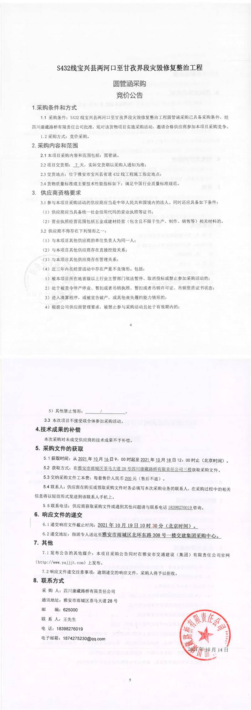 四川康藏路橋有限責(zé)任公司S432線寶興縣兩河口至甘孜界段災(zāi)毀修復(fù)整治工程圓管涵采購(gòu)競(jìng)價(jià)公告