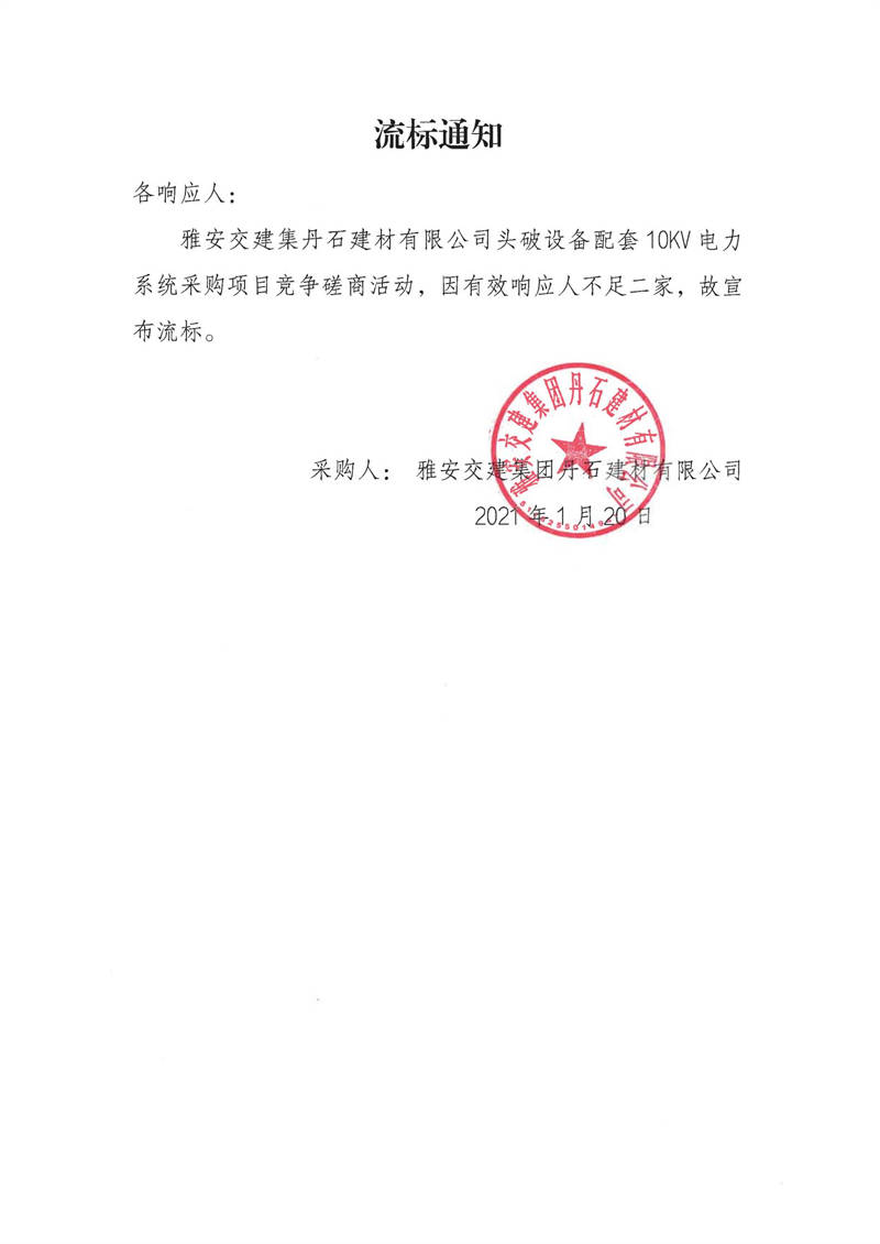 雅安交建集團丹石建材有限公司頭破設備配套10KV電力系統(tǒng)采購項目流標通知
