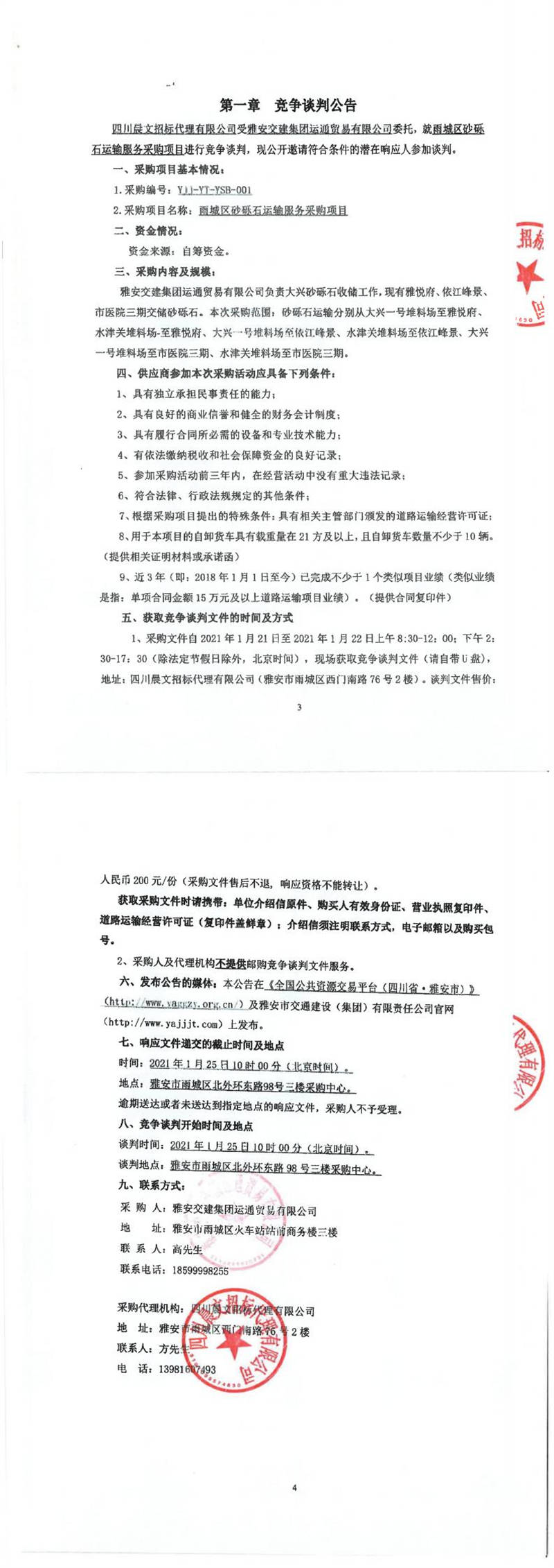 雅安交建集團(tuán)運(yùn)通貿(mào)易有限公司雨城區(qū)砂礫石運(yùn)輸服務(wù)采購項(xiàng)目競爭談判公告