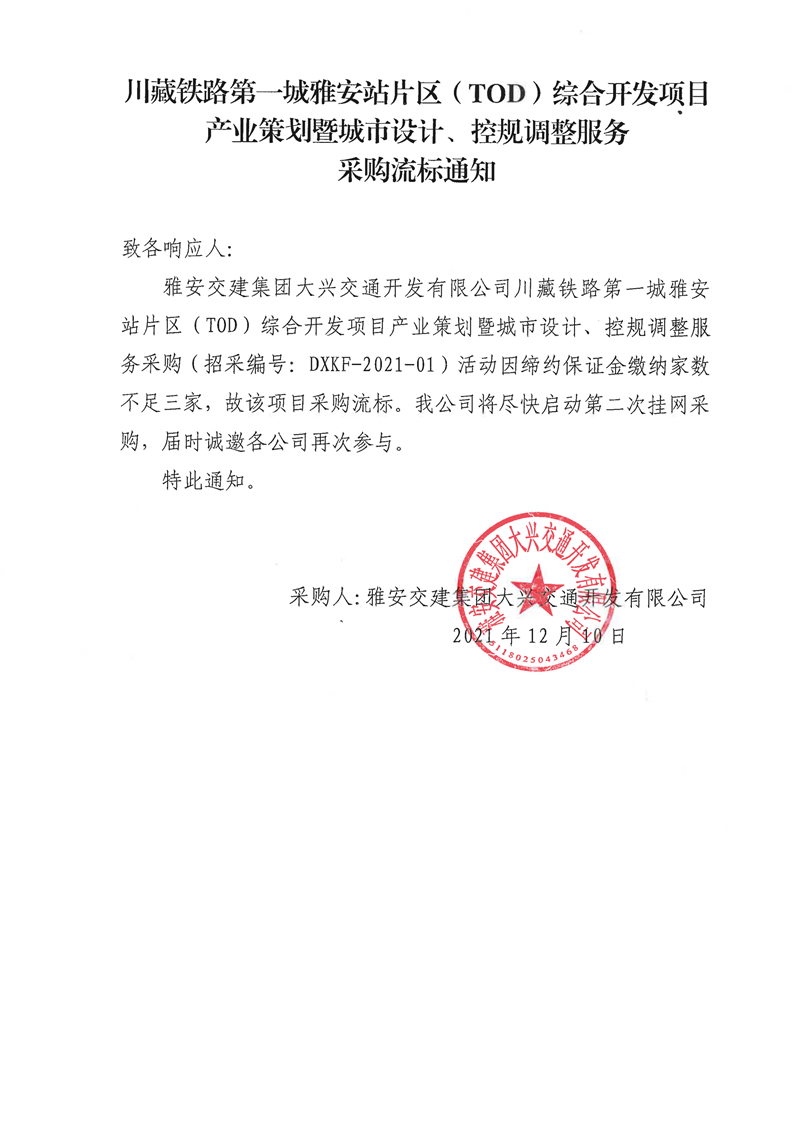 雅安交建集團(tuán)大興交通開發(fā)有限公司川藏鐵路第一城雅安站片區(qū)(TOD)綜合開發(fā)項(xiàng)目產(chǎn)業(yè)策劃暨城市設(shè)計、控規(guī)調(diào)整服務(wù)采購流標(biāo)通知