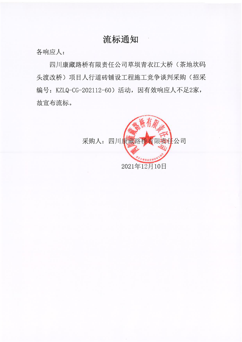 四川康藏路橋有限責(zé)任公司草壩青衣江大橋(茶地坎碼頭渡改橋)項目人行道磚鋪設(shè)工程施工競爭談判采購流標通知