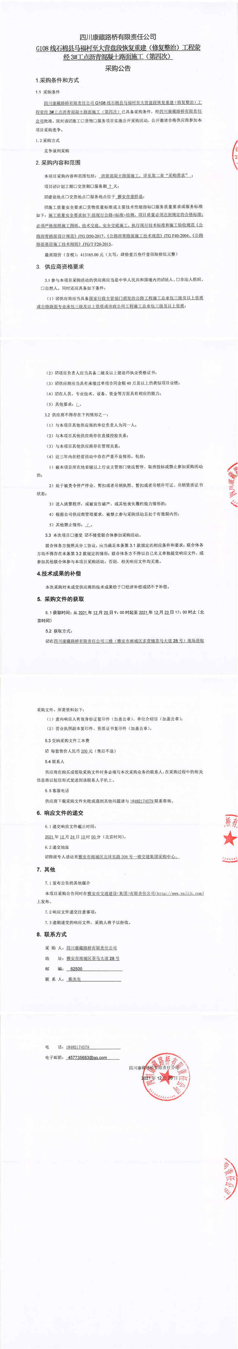 四川康藏路橋有限責(zé)任公司G108線石棉縣馬福村至大營(yíng)盤(pán)段恢復(fù)重建(修復(fù)整治)工程滎經(jīng)3#工點(diǎn)瀝青混凝土路面施工(第四次)采購(gòu)公告