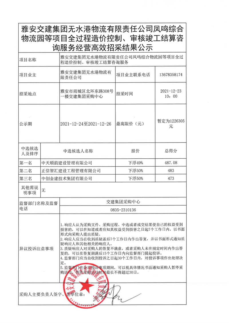 雅安交建集團無水港物流有限責任公司鳳鳴綜合物流等項目全過程造價控制、審核竣工結算咨詢服務經(jīng)營高效招采結果公示