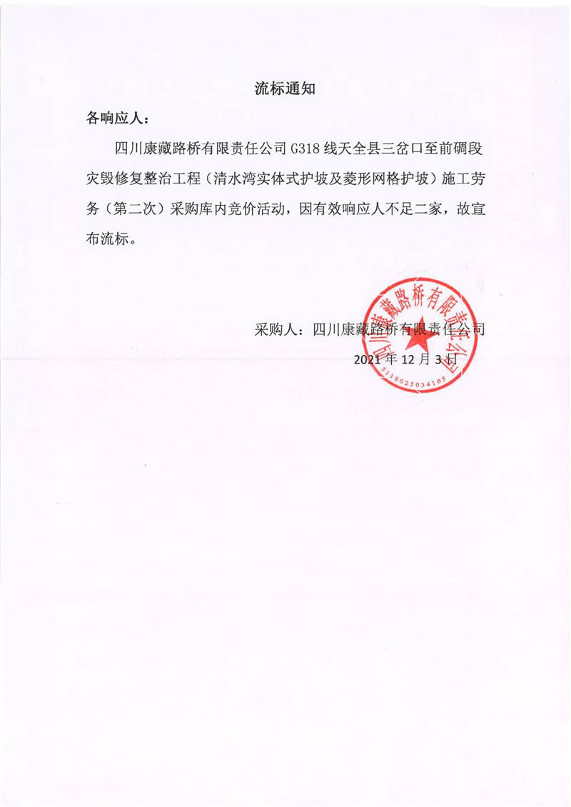 四川康藏路橋有限責(zé)任公司G318線天全縣三岔口至前碉段災(zāi)毀修復(fù)整治工程(清水灣實(shí)體式護(hù)坡及菱形網(wǎng)格護(hù)坡)施工勞務(wù)(第二次)采購(gòu)流標(biāo)通知