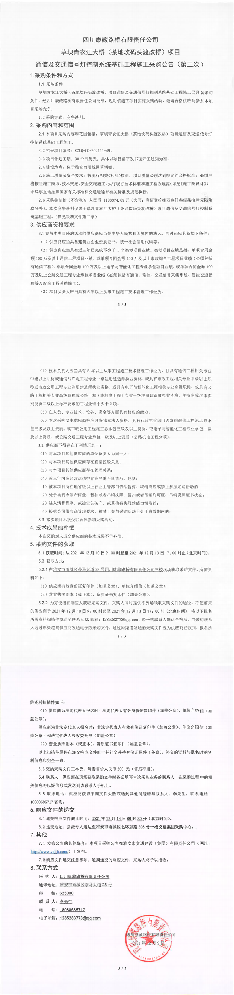 四川康藏路橋有限責任公司草壩青衣江大橋(茶地坎碼頭渡改橋)項目通信及交通信號燈控制系統(tǒng)基礎(chǔ)工程施工采購公告(第三次)