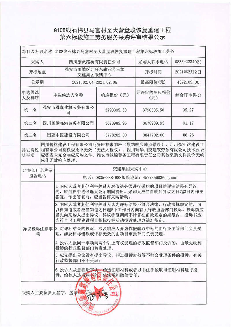 四川康藏路橋有限責任公司G108線石棉縣馬富村至大營盤段恢復重建工程第六標段施工勞務服務采購評審結(jié)果公示