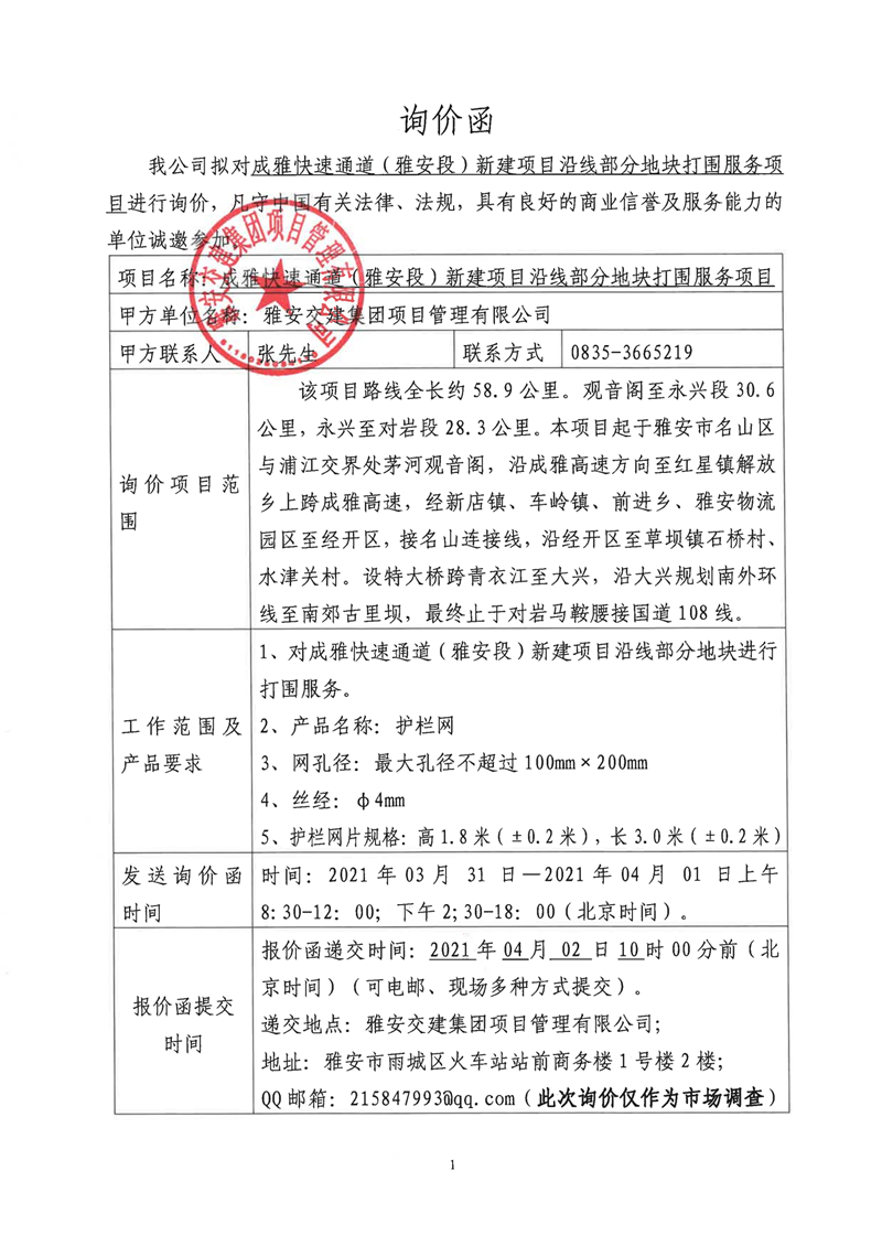 雅安交建集團(tuán)項(xiàng)目管理有限公司成雅快速通道(雅安段)新建項(xiàng)目沿線部分地塊打圍服務(wù)項(xiàng)目詢價函