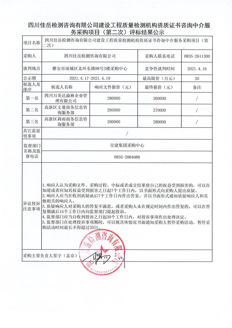 四川佳岳檢測咨詢有限公司建設(shè)工程質(zhì)量檢測機(jī)構(gòu)資質(zhì)證書咨詢中介服務(wù)采購項(xiàng)目(第二次)評(píng)標(biāo)結(jié)果公示