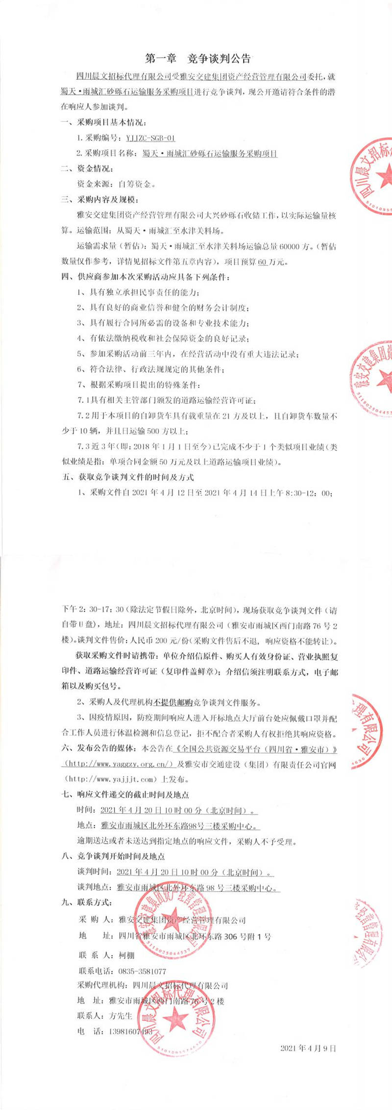 雅安交建集團(tuán)資產(chǎn)經(jīng)營管理有限公司蜀天.雨城匯砂礫石運(yùn)輸服務(wù)采購項(xiàng)目競爭談判公告