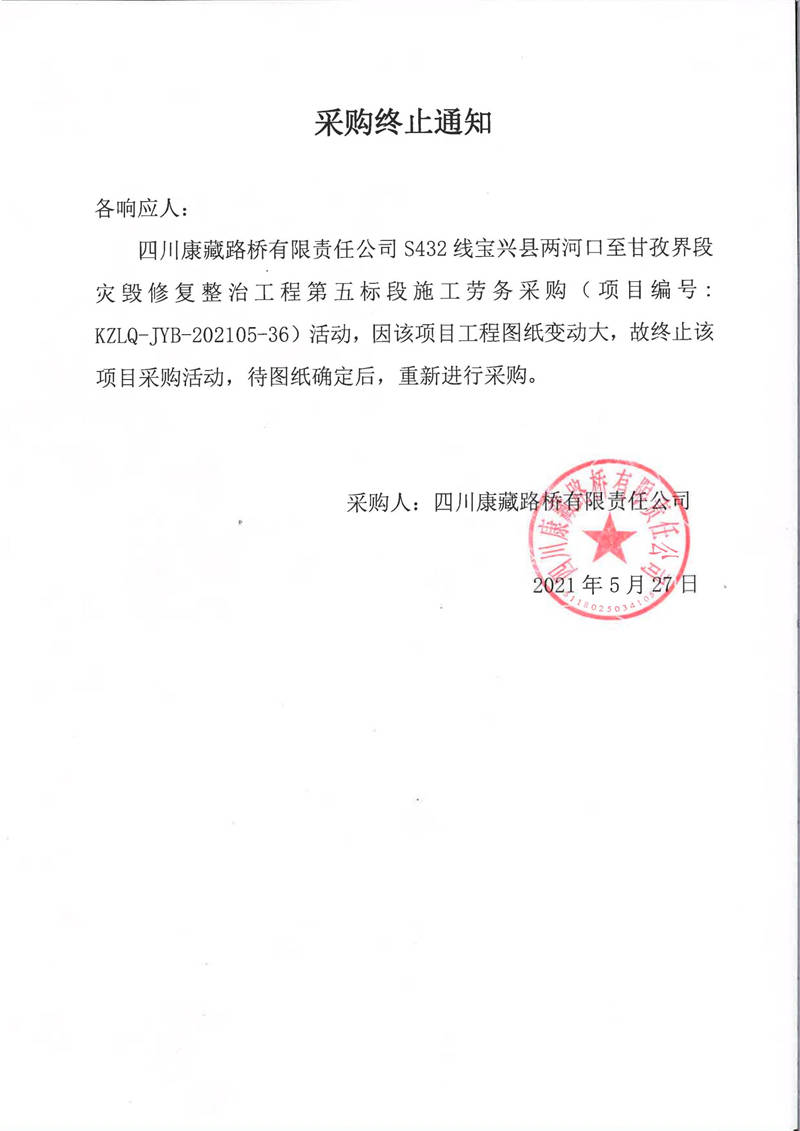 四川康藏路橋有限責任公司S432線寶興縣兩河口至甘孜界段災毀修復整治工程第五標段施工勞務(wù)采購終止通知