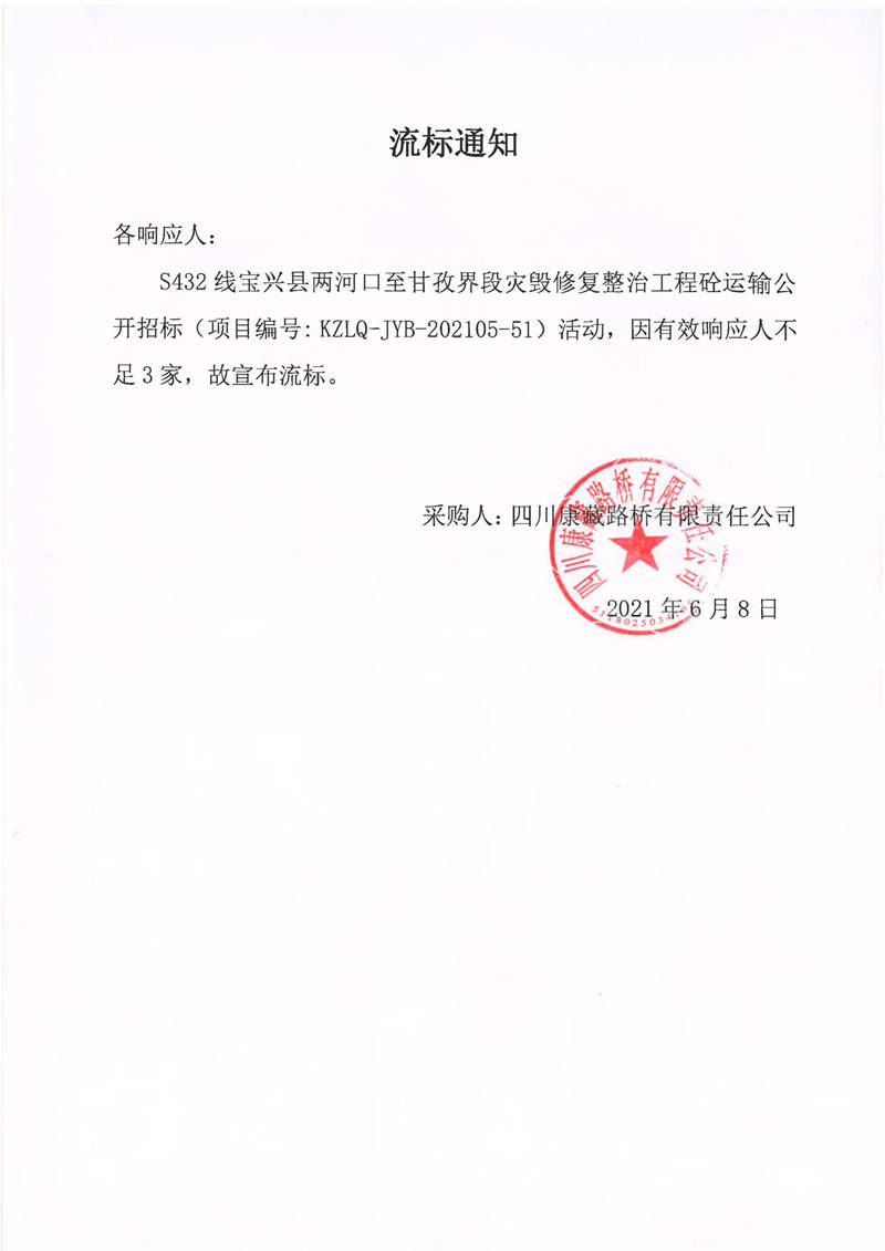 四川康藏路橋有限責任公司S432線寶興縣兩河口至甘孜界段災毀修復整治工程砼運輸流標通知