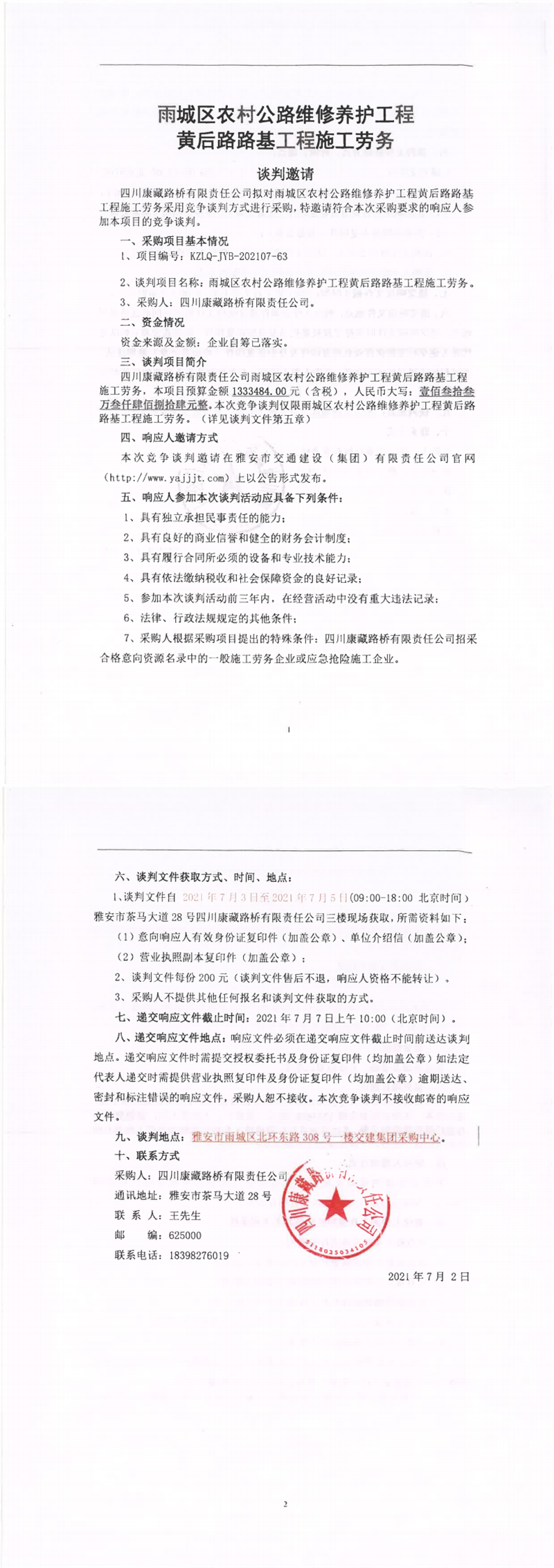 四川康藏路橋有限責任公司雨城區(qū)農(nóng)村維修養(yǎng)護工程黃后路路基工程施工勞務競爭談判公告